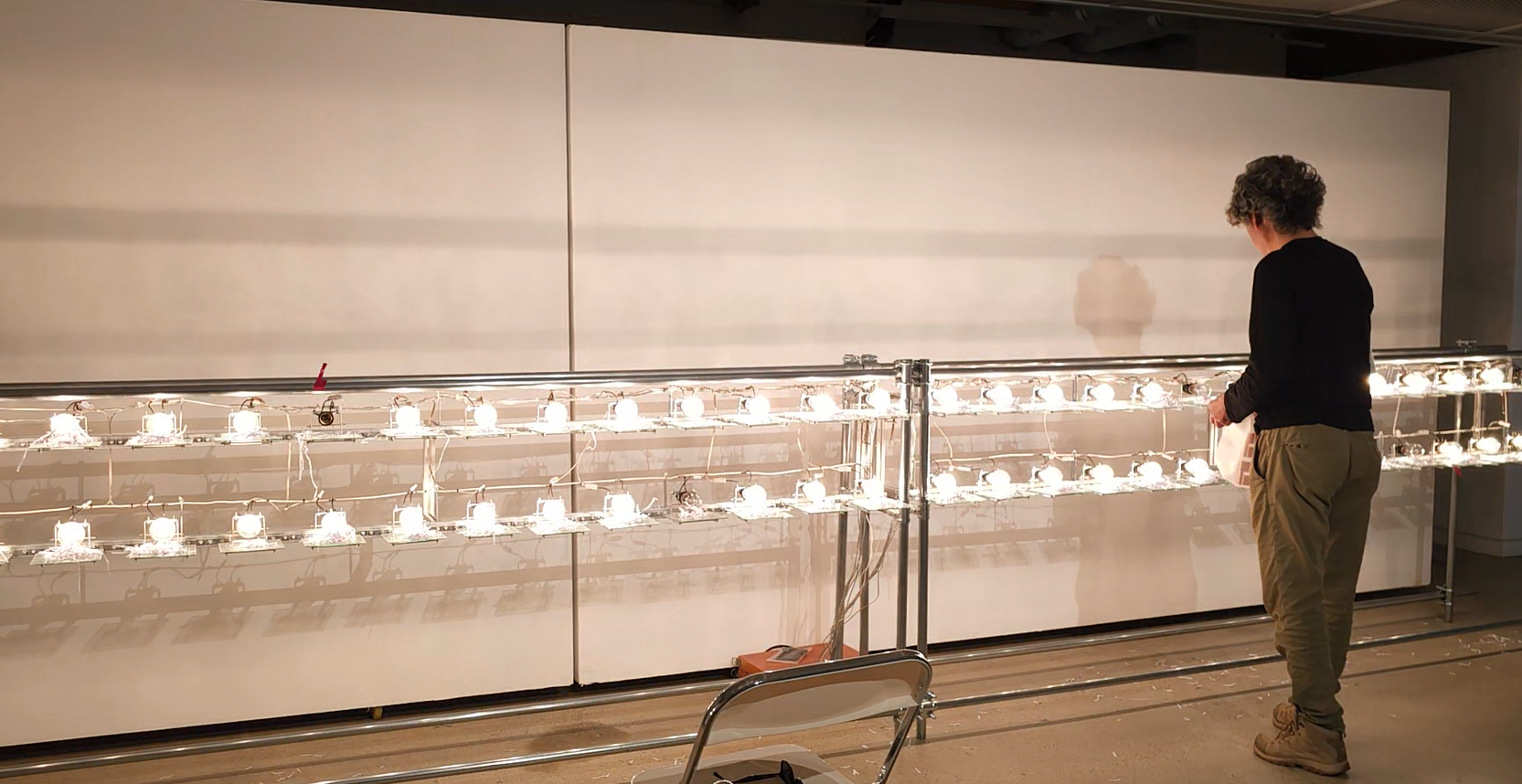 이탈 Lee Tal, 《나는 너를 모른다 (I Don’t Know You)》, 2025, 조명 장치, 아두이노, 센서, 릴레이, 금속 프레임, 가변 설치, 600×120×50cm